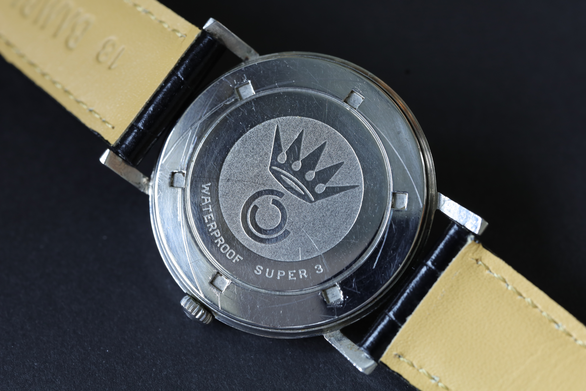 The case back is engraved with the iconic crown mark and the words "WATERPROOF SUPER 3," demonstrating the brand's pride and robust construction.