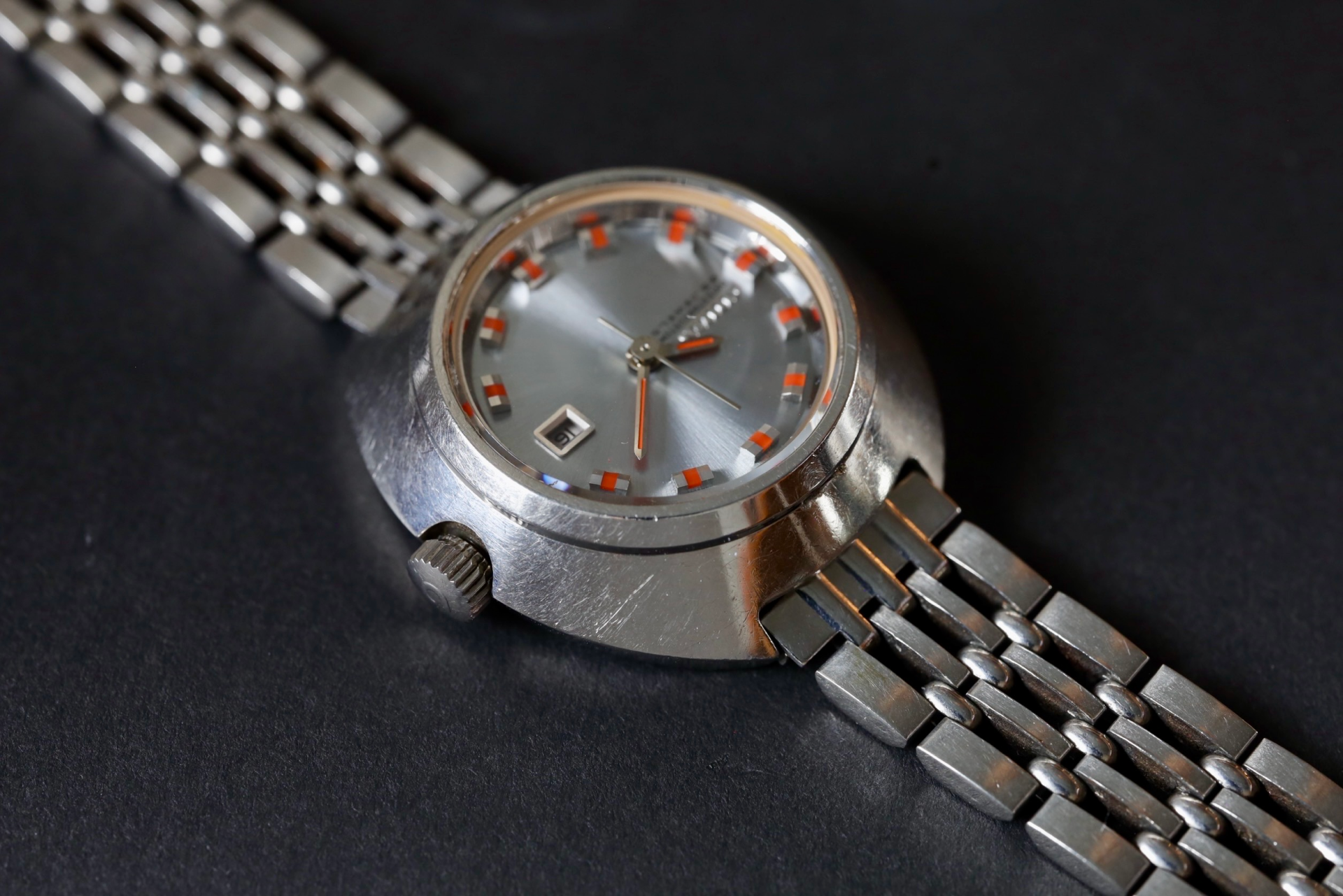 This unique watch features a sunray-finished gray dial with vibrant orange accents.