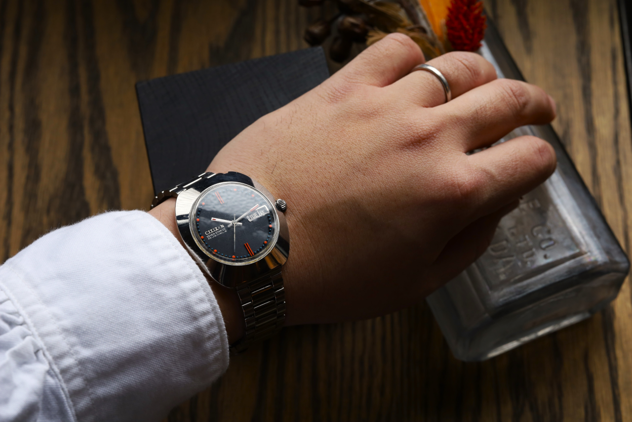 シチズンのロゴとペットネームの位置は9時位置にあり、デイデイト表示と一列に並ぶので、全体がスッキリとして見えるように配置されています。