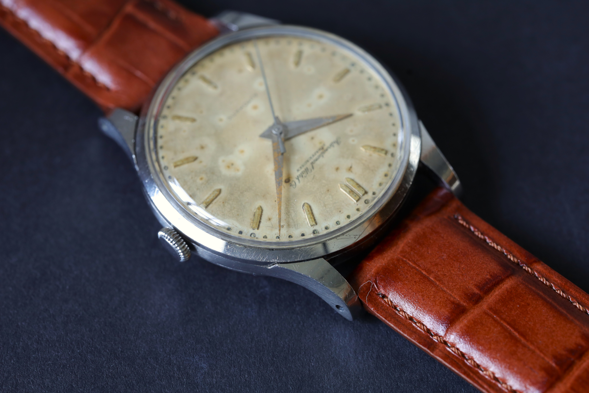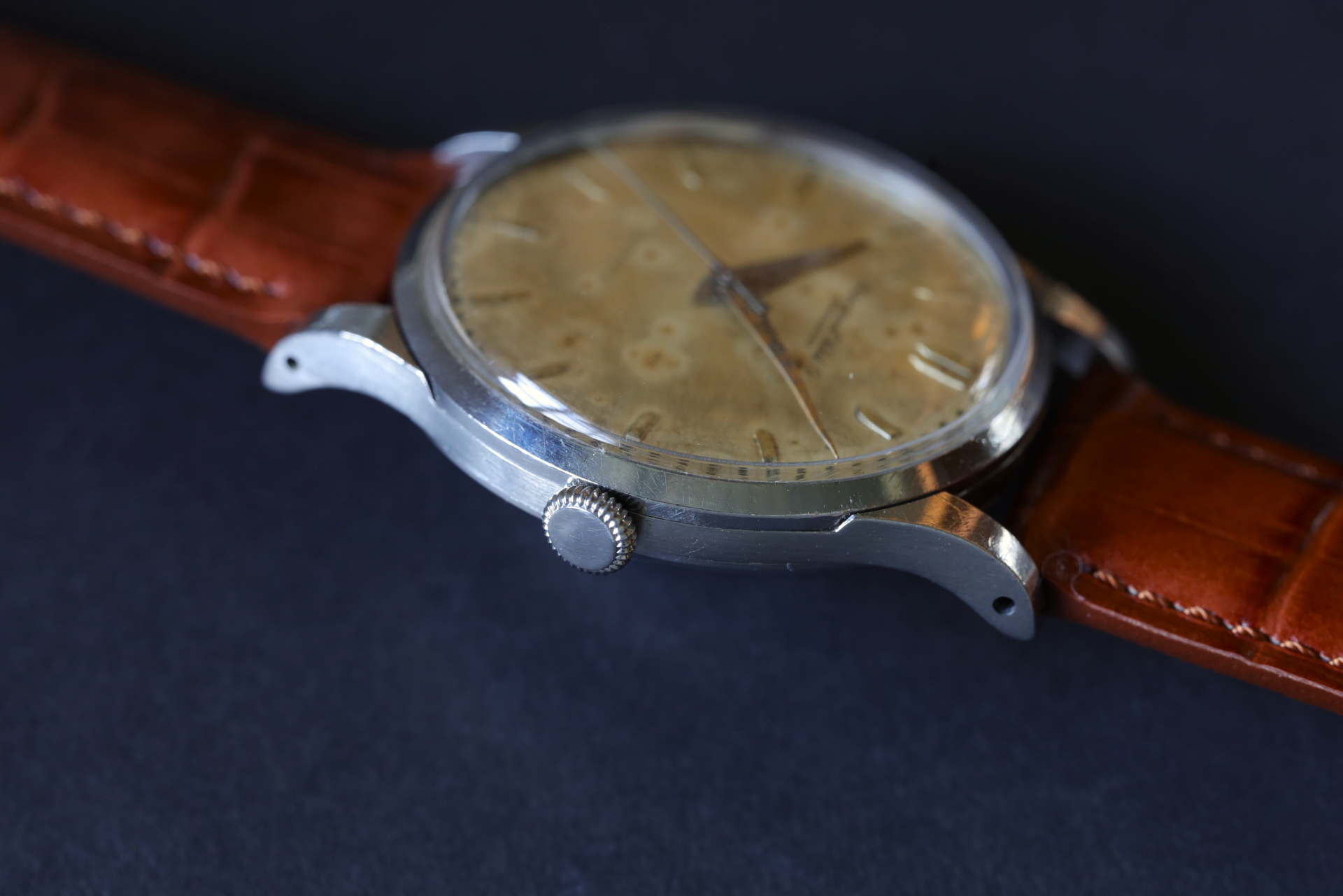 柔らかいベージュカラーへと変化した文字盤は、70年もの時間を経たからこそ生まれる深みのある表情を備え、ヴィンテージ特有の魅力を存分に感じさせます。