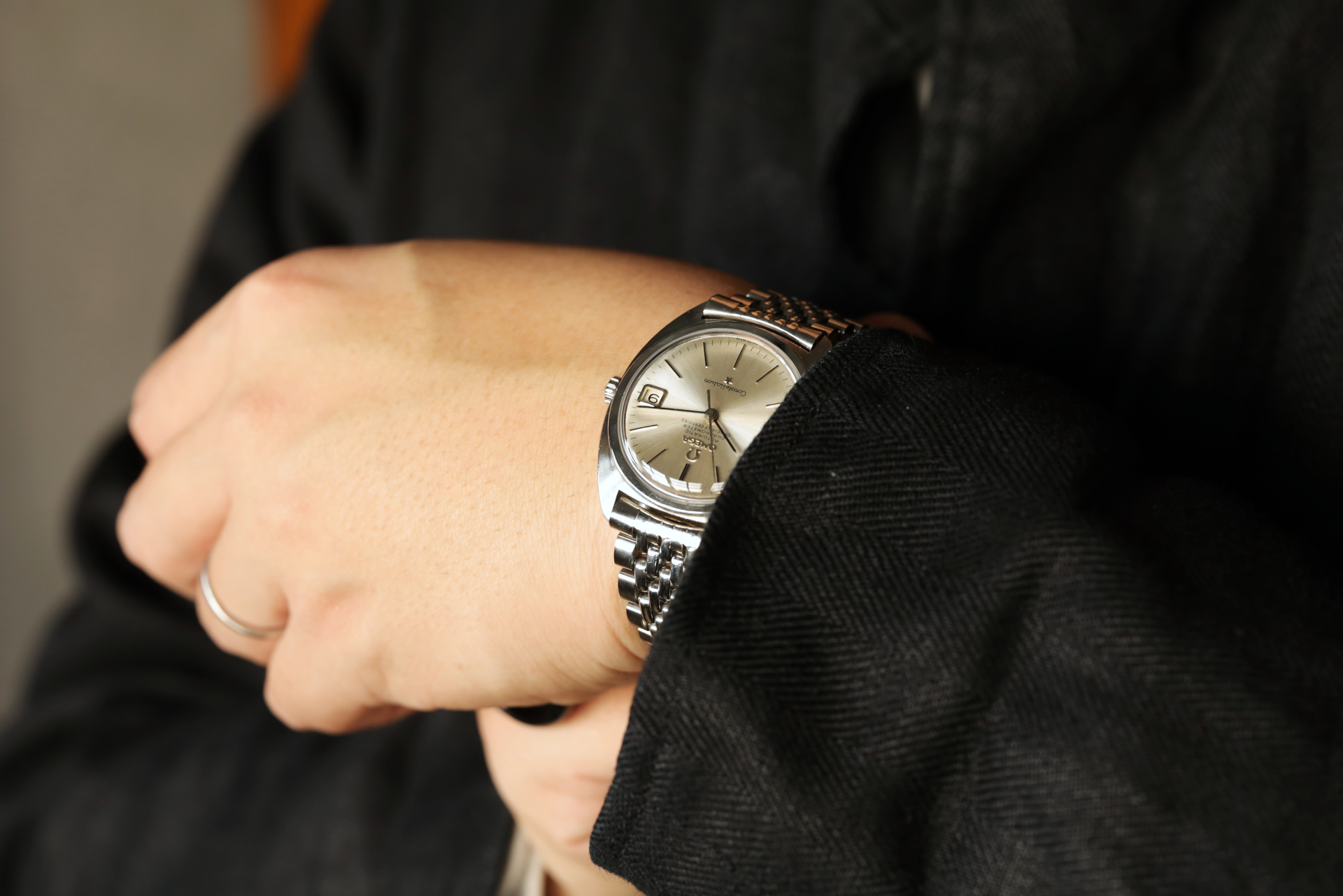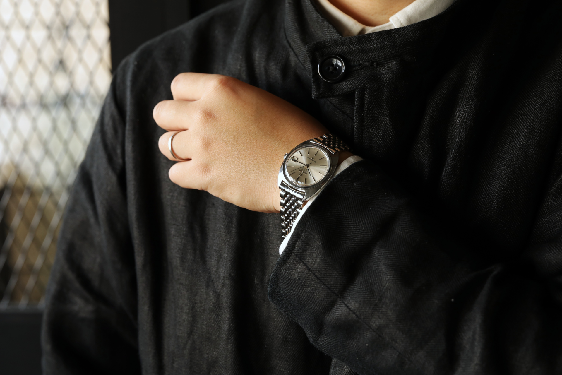 ジャケットやウールスラックスと合わせれば、Cラインケースの滑らかな造形とメタリックな質感が引き立ち、装い全体に端正でクリーンな印象を添えてくれます。