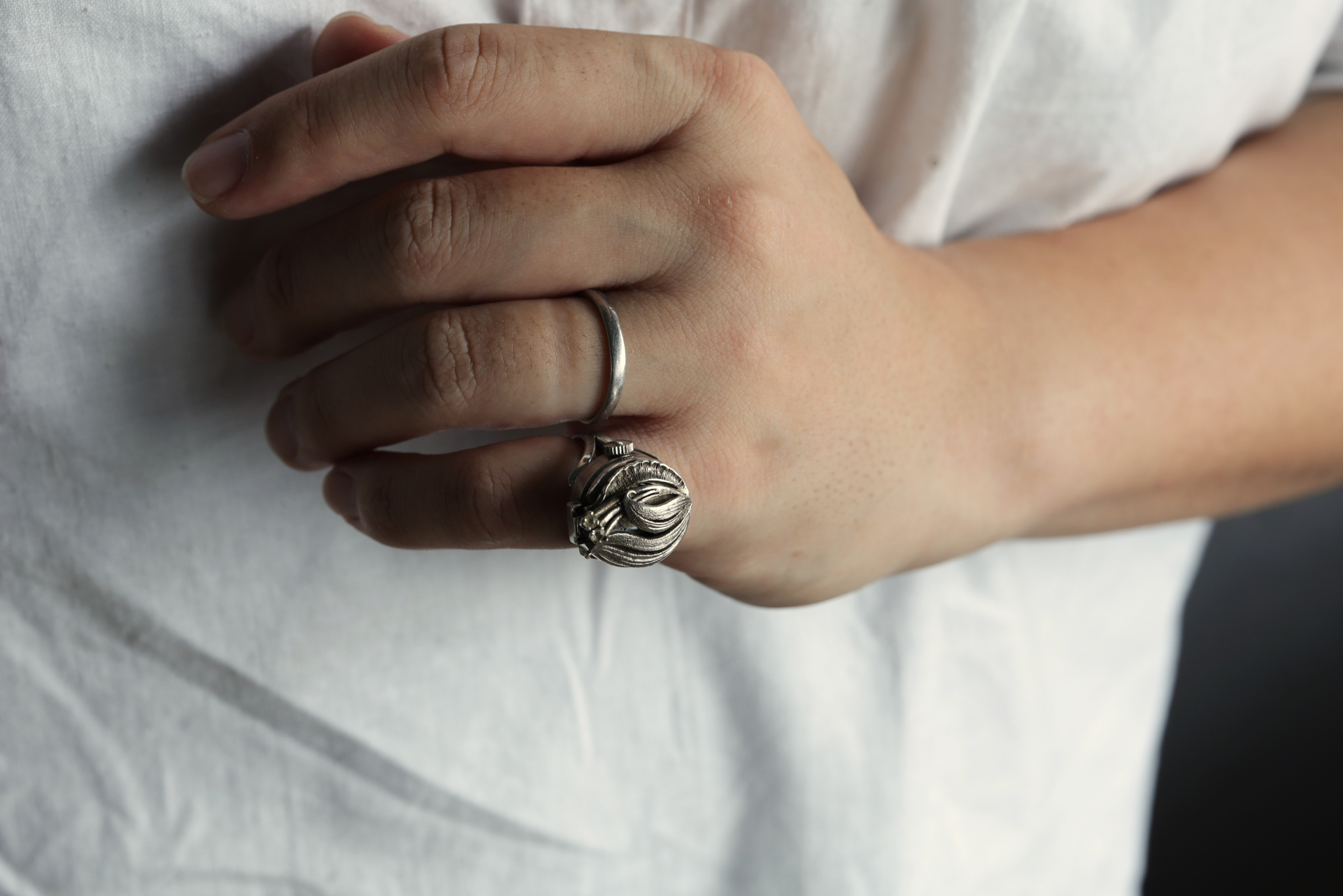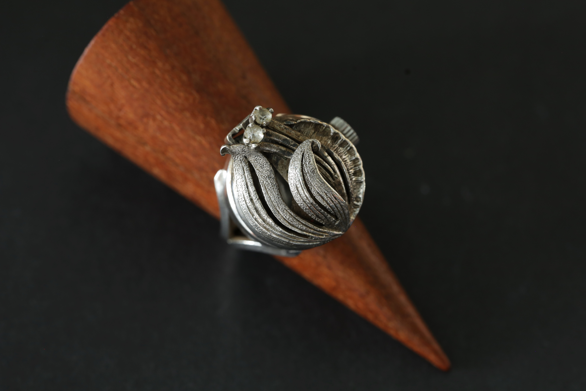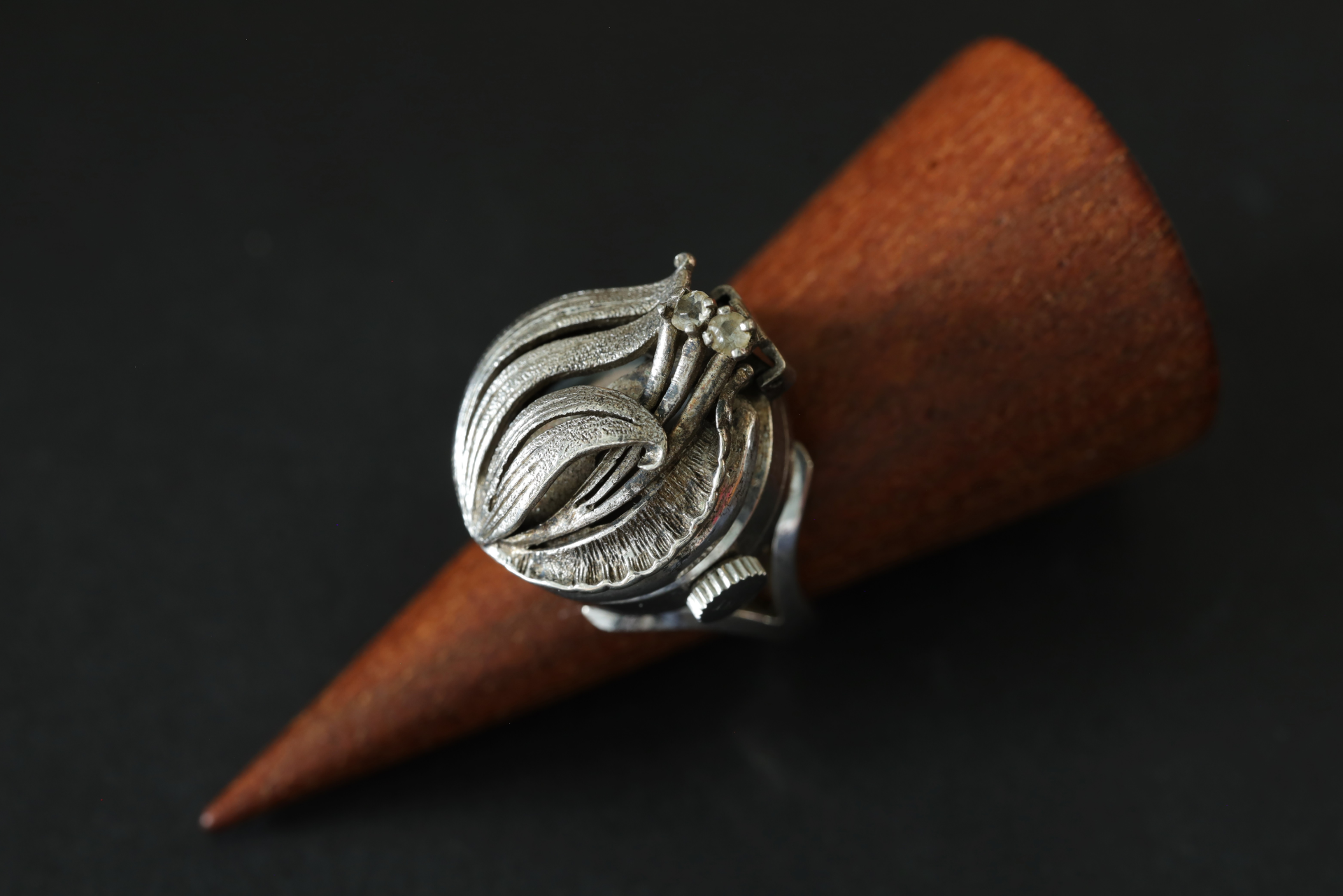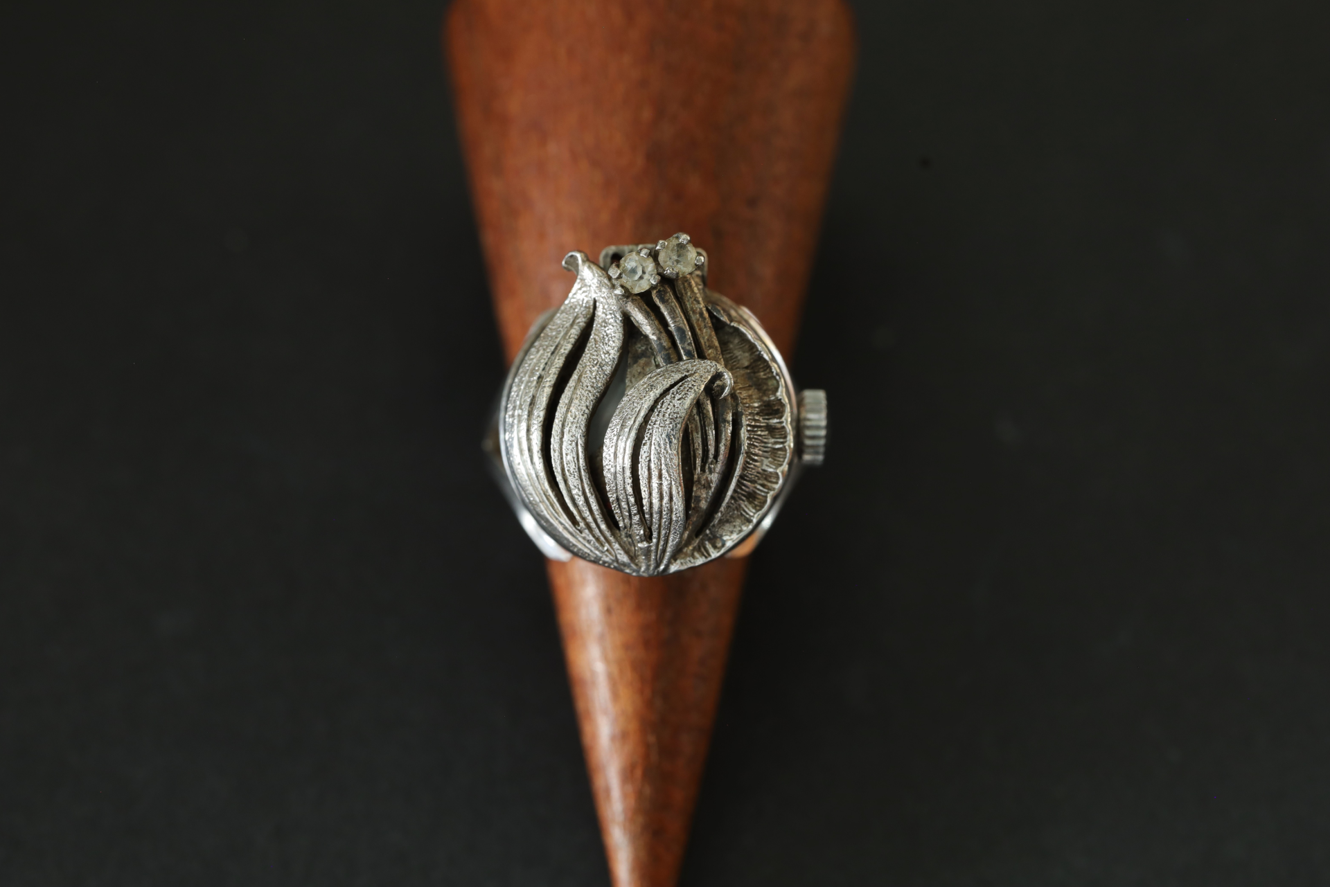 繊細な彫金仕上げに、小さなストーンがさりげなくあしらわれ、光を浴びることで、やさしい輝きを放ちます。