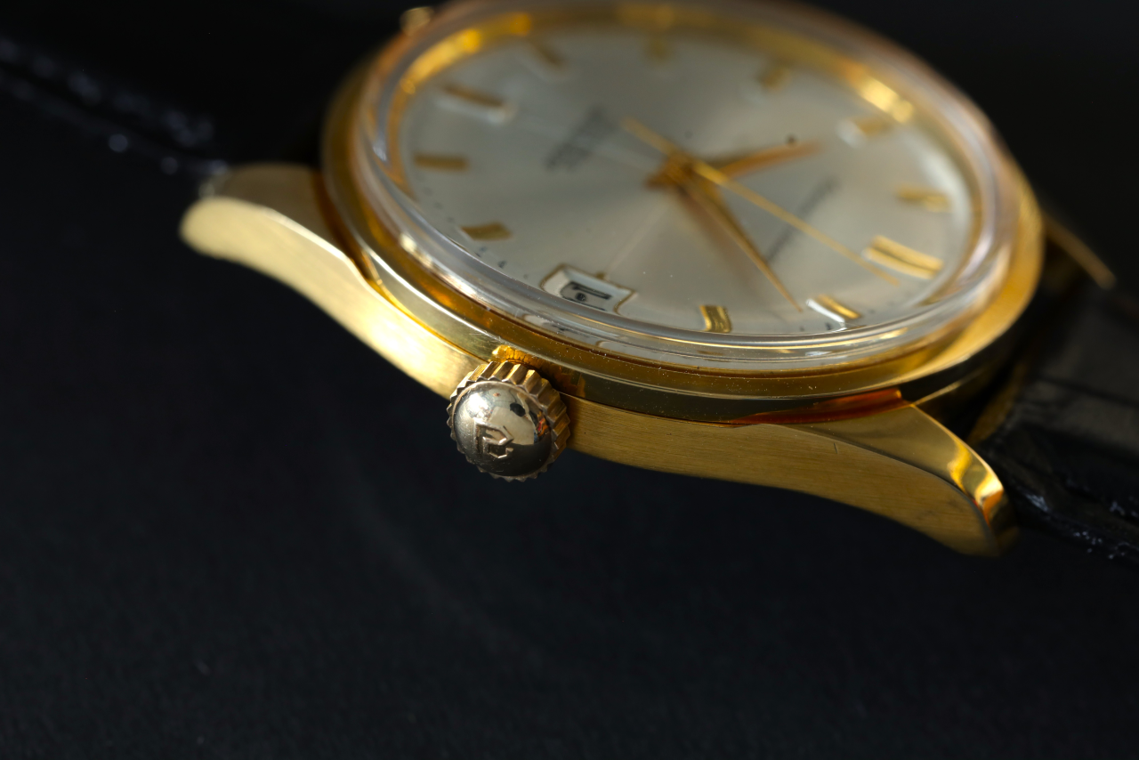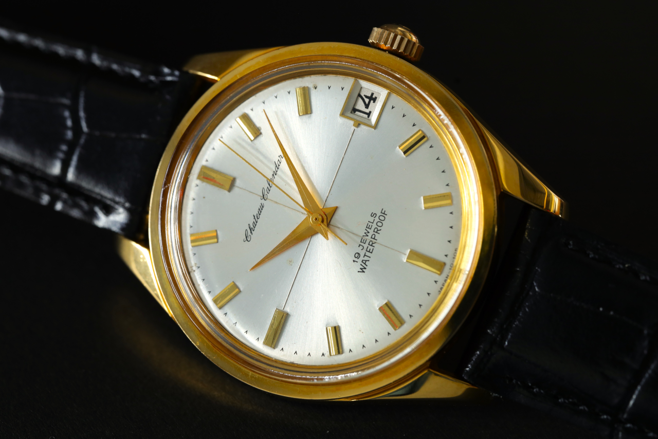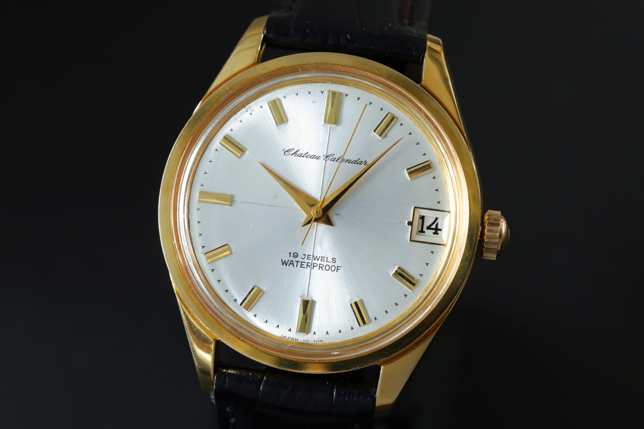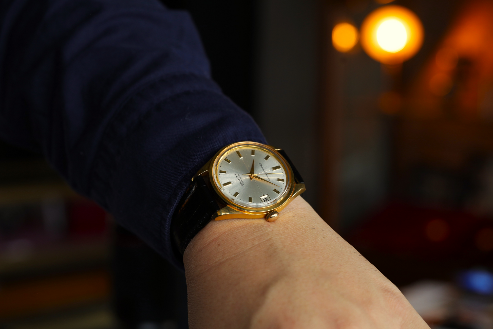 宝飾を思わせる気品あるゴールドカラーのラウンドケースは、60年代にしては珍しいビッグフェイス仕様。