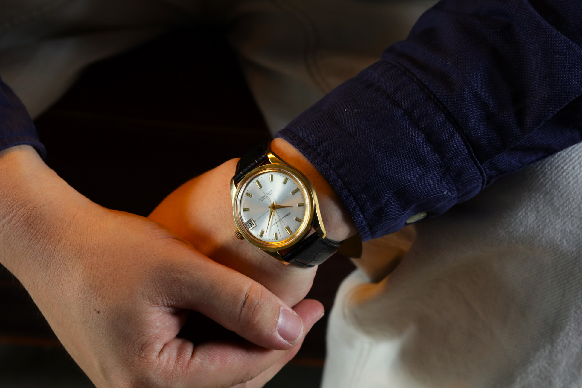 60年代の時計としては大振りなサイズ感ですが、薄型手巻き時計として設計されているので、着用感に優れ、軽量なので、長時間のあいだ着用しても疲れにくいです。